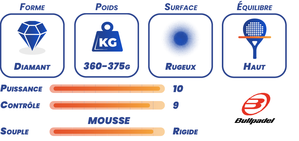 De forme diamant avec poids en tête de raquette, la raquette de padel Vertex 04 concentre le meilleur des technologies de la marque Bullpadel.
