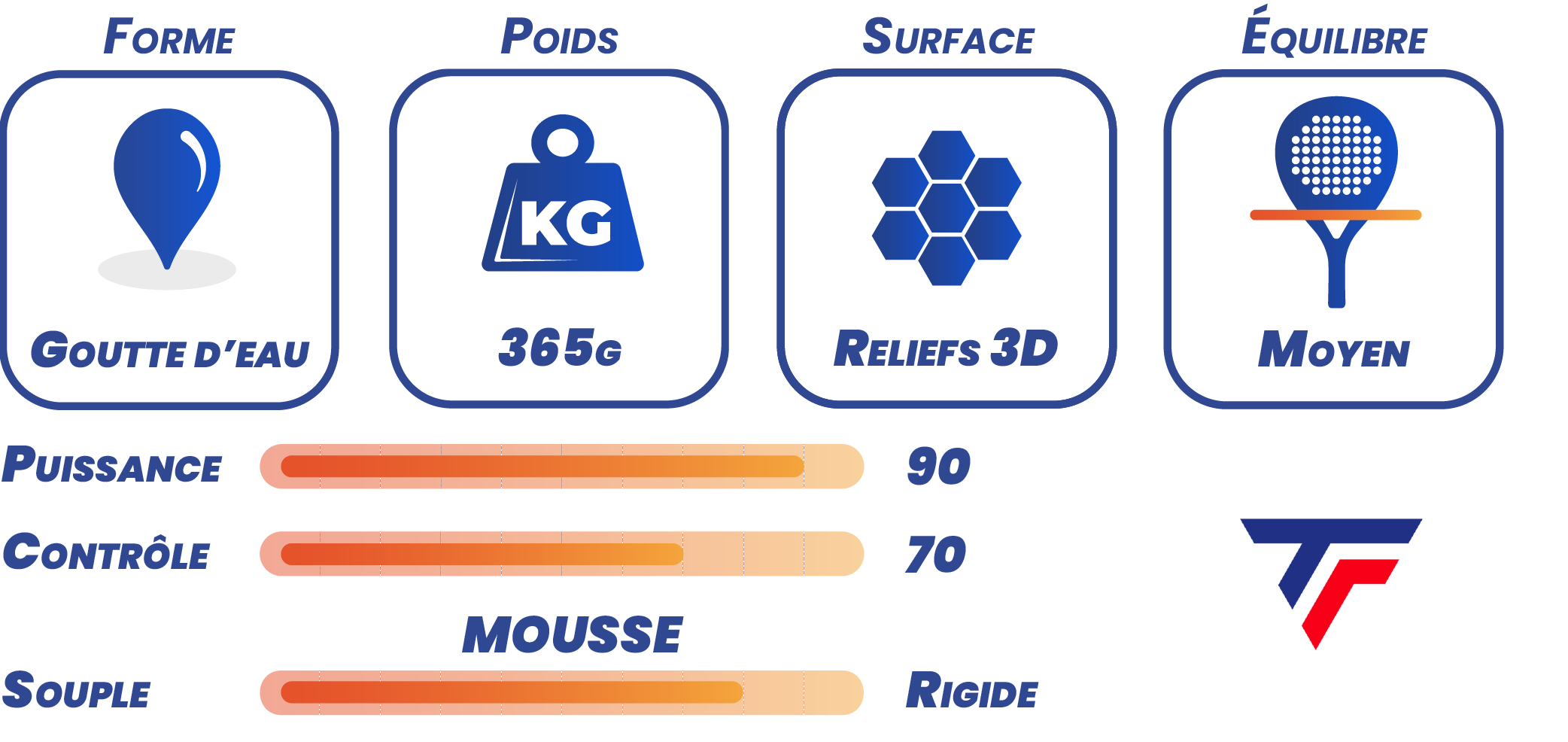 Le tamis est recouvert d'un relief "Spin Skin 3D" pour une prise des effets maximale. Plan de perçage PHD avec des trous de 3 diamètres différents permettant de maximiser la précision au centre et la tolérance aux coups décentrés aux extrémités.